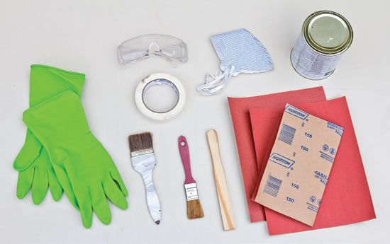 Você precisará de luva, óculos de proteção, lixa 150, máscara protetora, fita adesiva, stain, mexedor e pincéis.